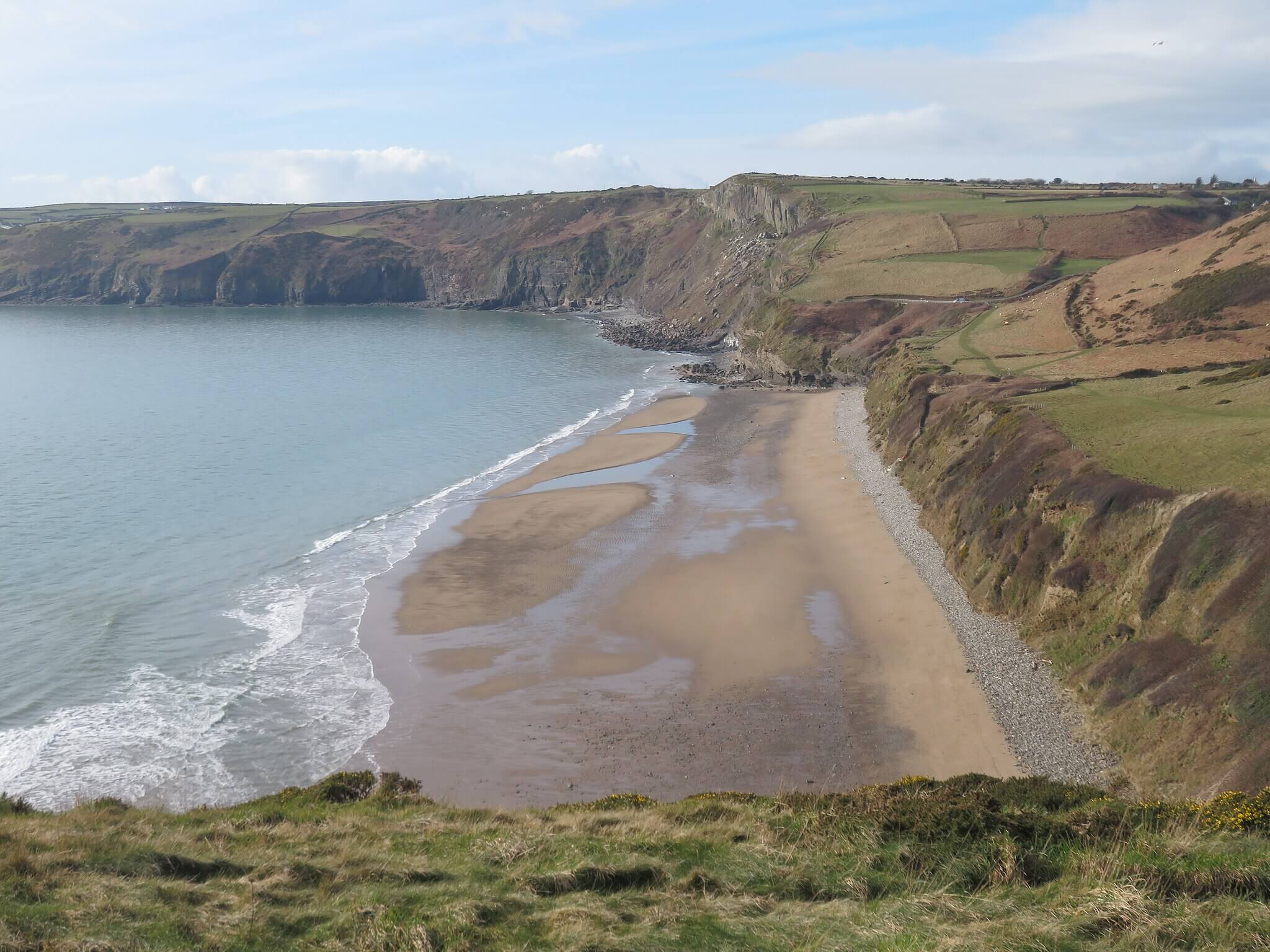 Nefyn Beach offers a long stretch of sand backed by a promenade and sits on the north coast of the peninsula. While there may be seasonal restrictions on small central sections during summer, dogs are generally welcome on large parts of the beach all year.