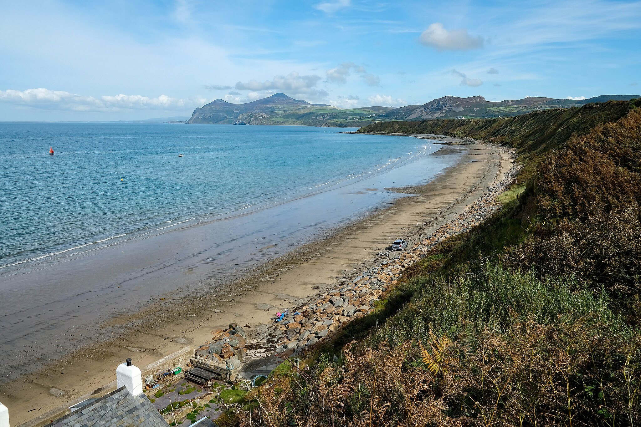 Llanbedrog Beach is a long, gently sloping sandy beach with views across Cardigan Bay. While there are seasonal restrictions on parts of the beach during summer, dogs are welcome on other sections all year.