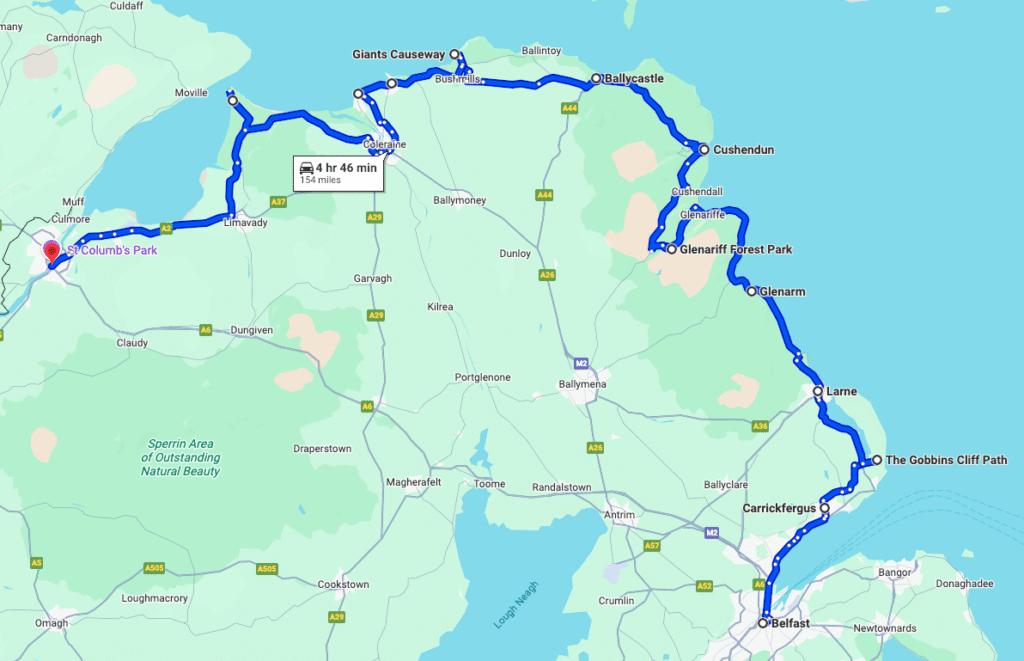 | 4 | Ballycastle to Bushmills | Giant’s Causeway, Dunluce Castle | Bush Caravan Park |