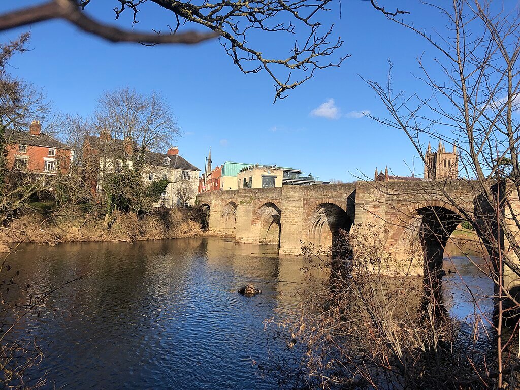 Hereford’s riverside path runs along the Wye from the Victoria Bridge in the west of the city to the Hunderton Bridge downstream, passing below the cathedral and through the Bishop’s Meadow. The full out-and-back along both banks is around 5.8 km (3.6 miles) and is almost entirely flat, making it the most accessible walk in this list. The path is well-maintained and easy to navigate, passing through managed parkland and open meadow with the city skyline and cathedral tower visible throughout. It serves as a useful base for visitors using Hereford as a hub before venturing into the wider county.