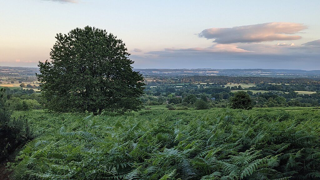 Bircher Common is a piece of ancient open heathland owned by the National Trust on the edge of the Mortimer Forest north of Ludlow. The walk from the common car park crosses the heathland, dips into the forestry plantation at High Vinnalls, and loops back across the ridge with views across north Herefordshire and into Shropshire. The circuit runs to 7.4 km (4.6 miles) and the common itself is one of the few surviving fragments of lowland heath in the Marches.