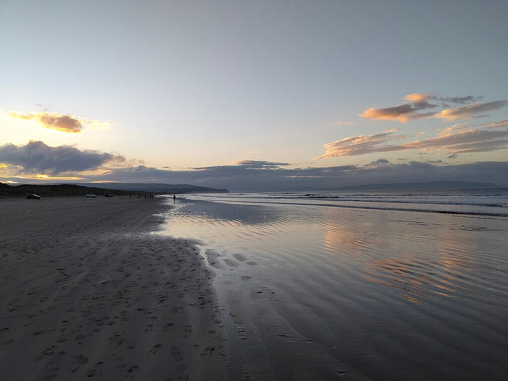 Ballycastle Beach sits at the northern tip of County Antrim, a wide sandy bay with views across to Rathlin Island and, on clear days, Scotland. The beach feels open and accessible, with a promenade at one end and golf course backing much of its length.
